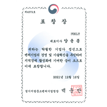 경기지방중소벤처기업청장 표창장 수상